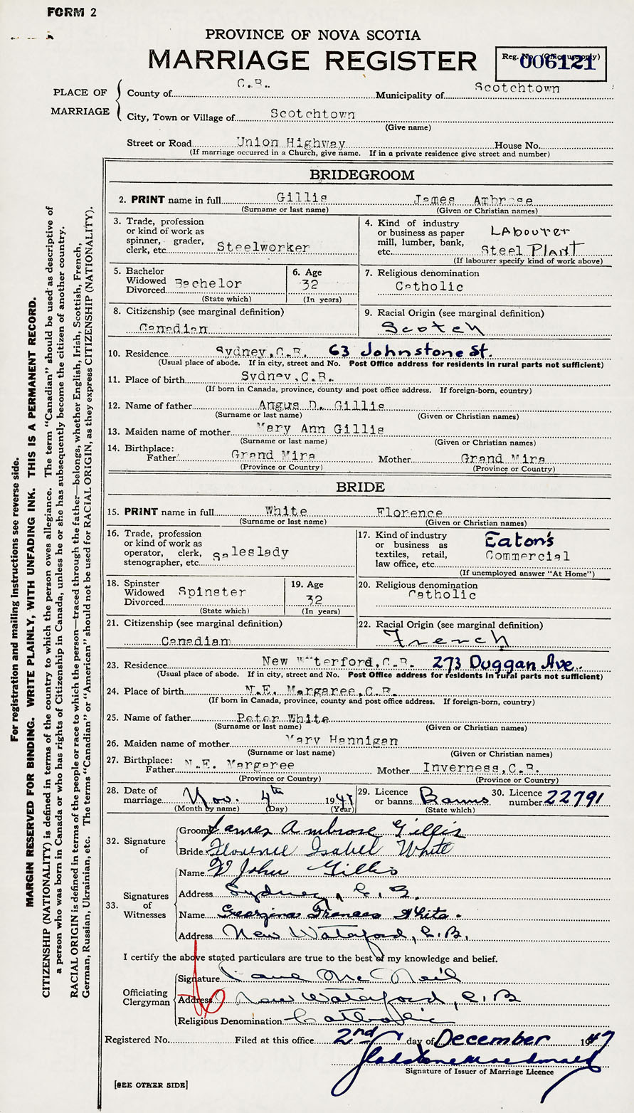 28. Date of marriage November 4 1947 29. By license or banns License 30. License number