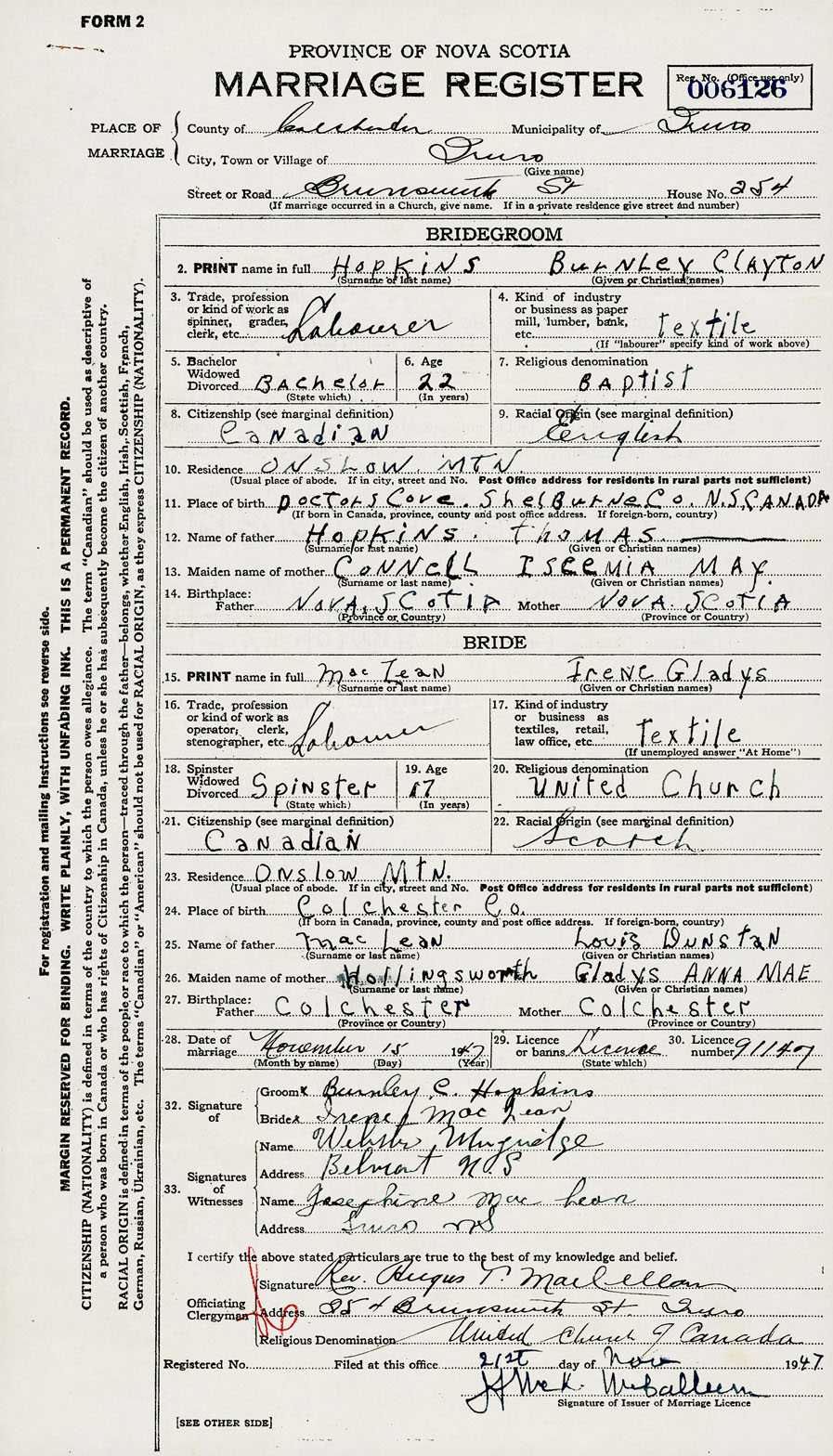 28. Date of marriage November 15 1947 29. By license or banns License 30. License number 006126