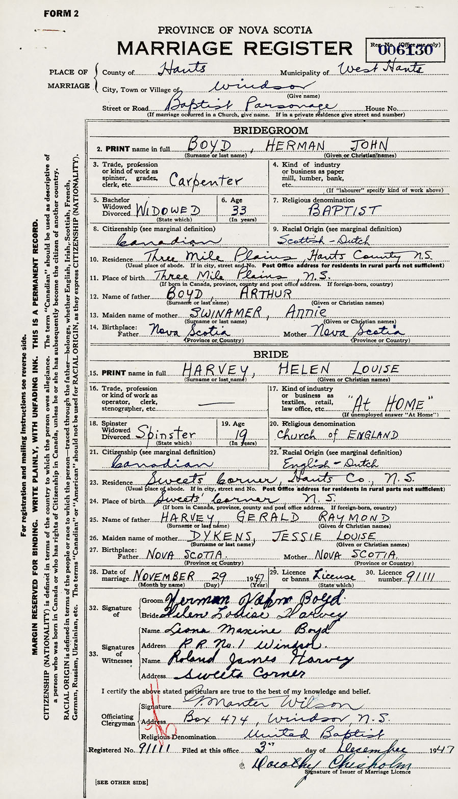28. Date of marriage November 29 1947 29. By license or banns License 30. License number 91111