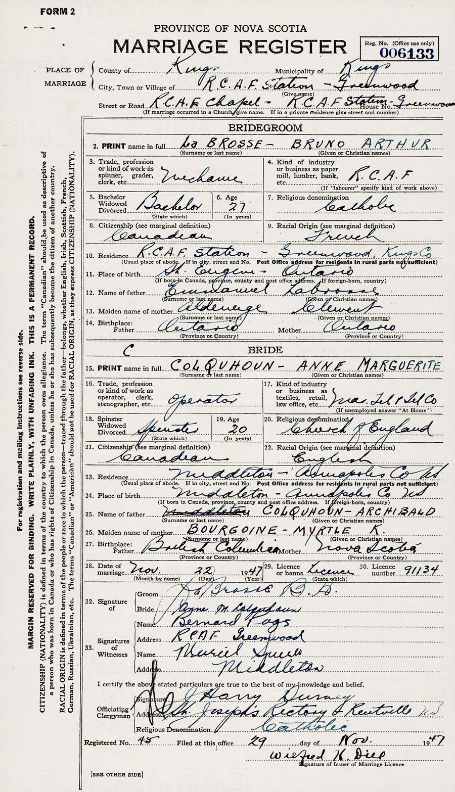 28. Date of marriage November 22 1947 29. By license or banns License 30. License number 91134