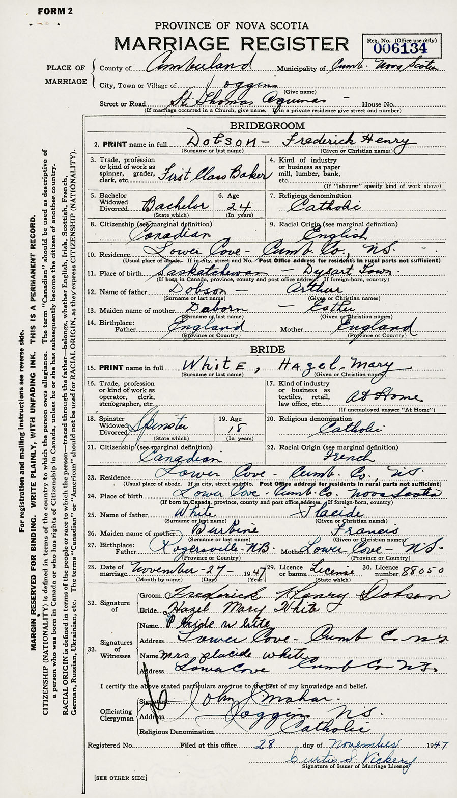 28. Date of marriage November 27 1947 29. By license or banns License 30. License number 88050