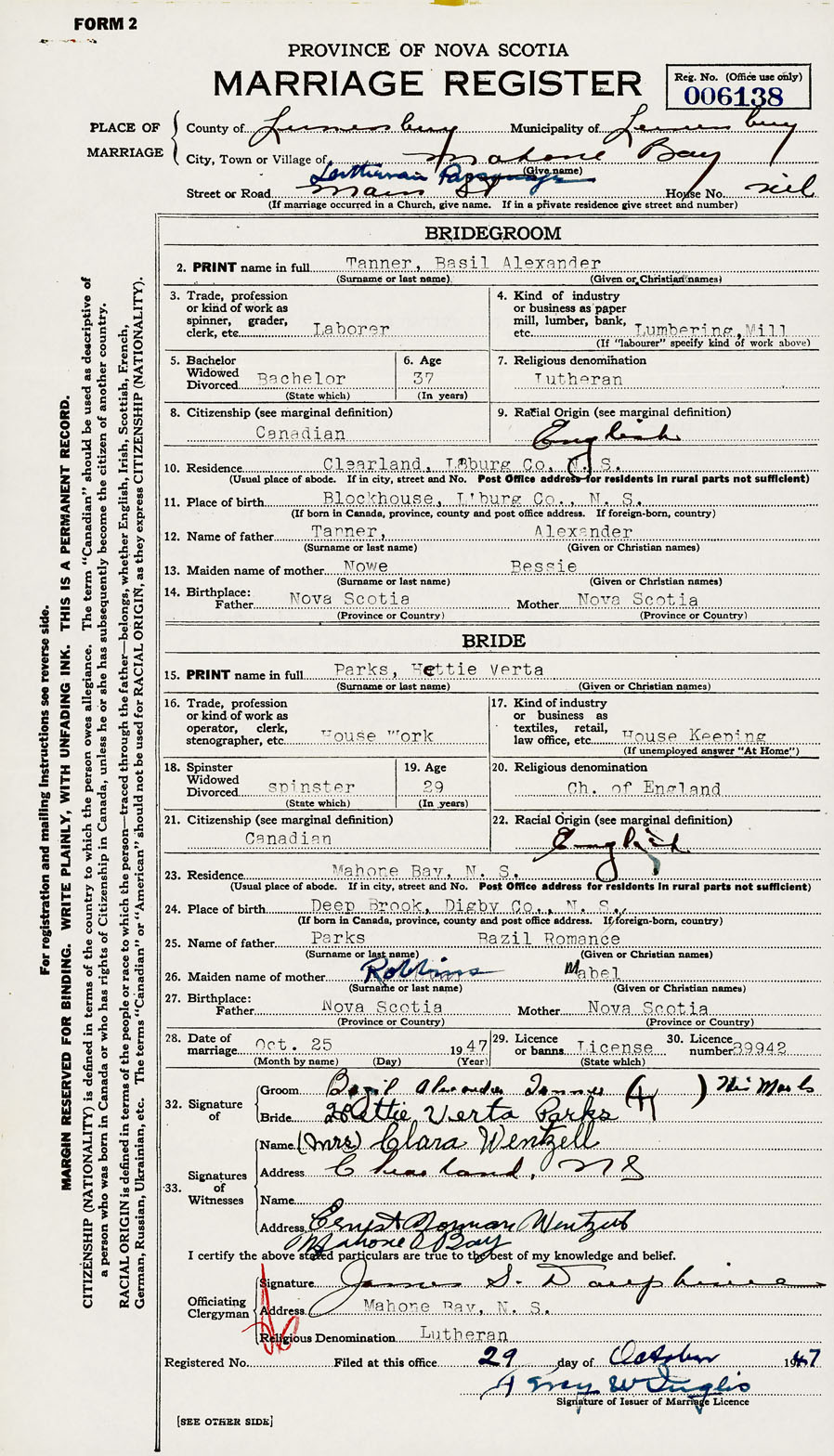 28. Date of marriage October 25 1947 29. By license or banns License 30. License number 89942