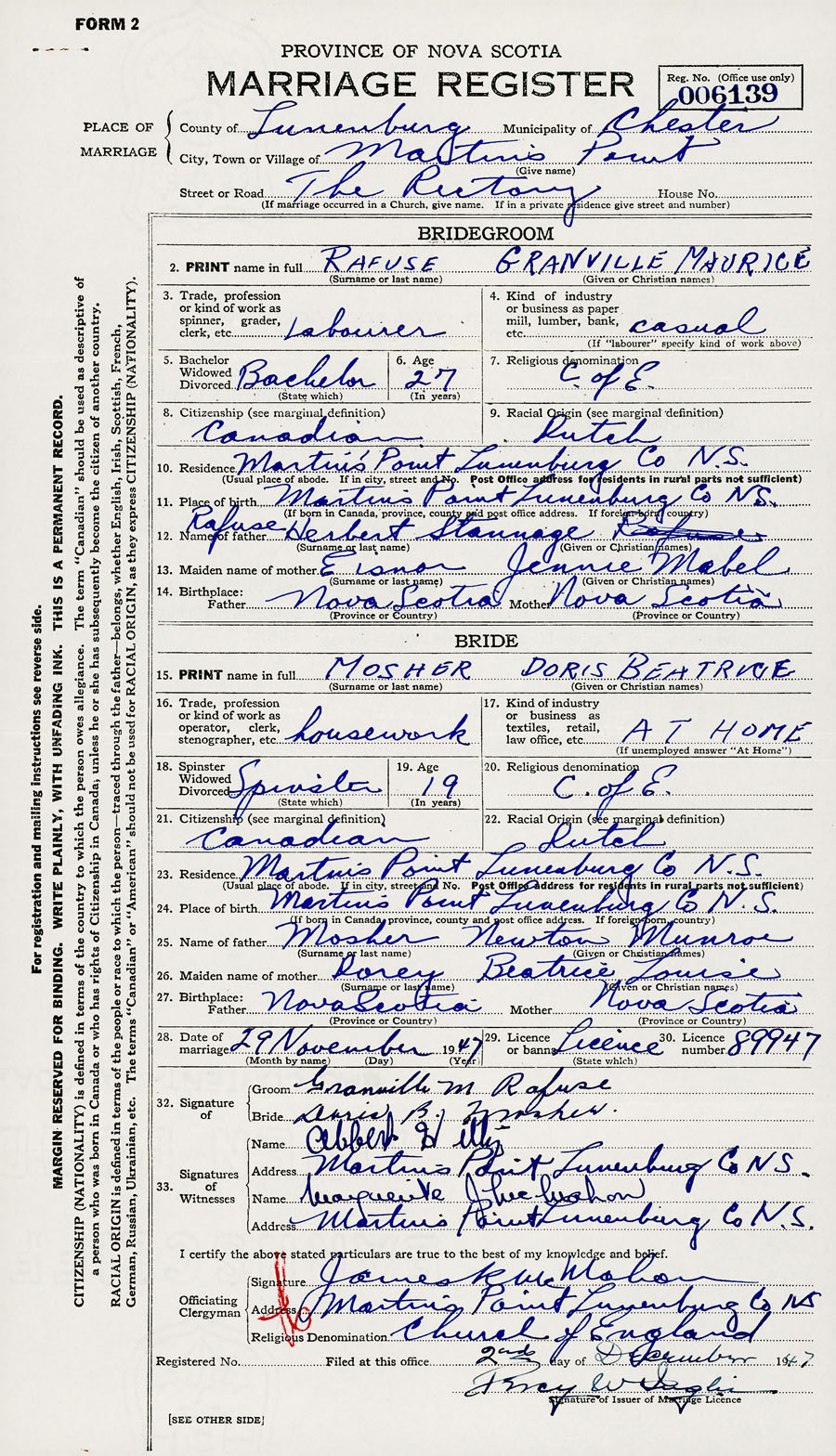 28. Date of marriage November 29 1947 29. By license or banns License 30. License number 89947