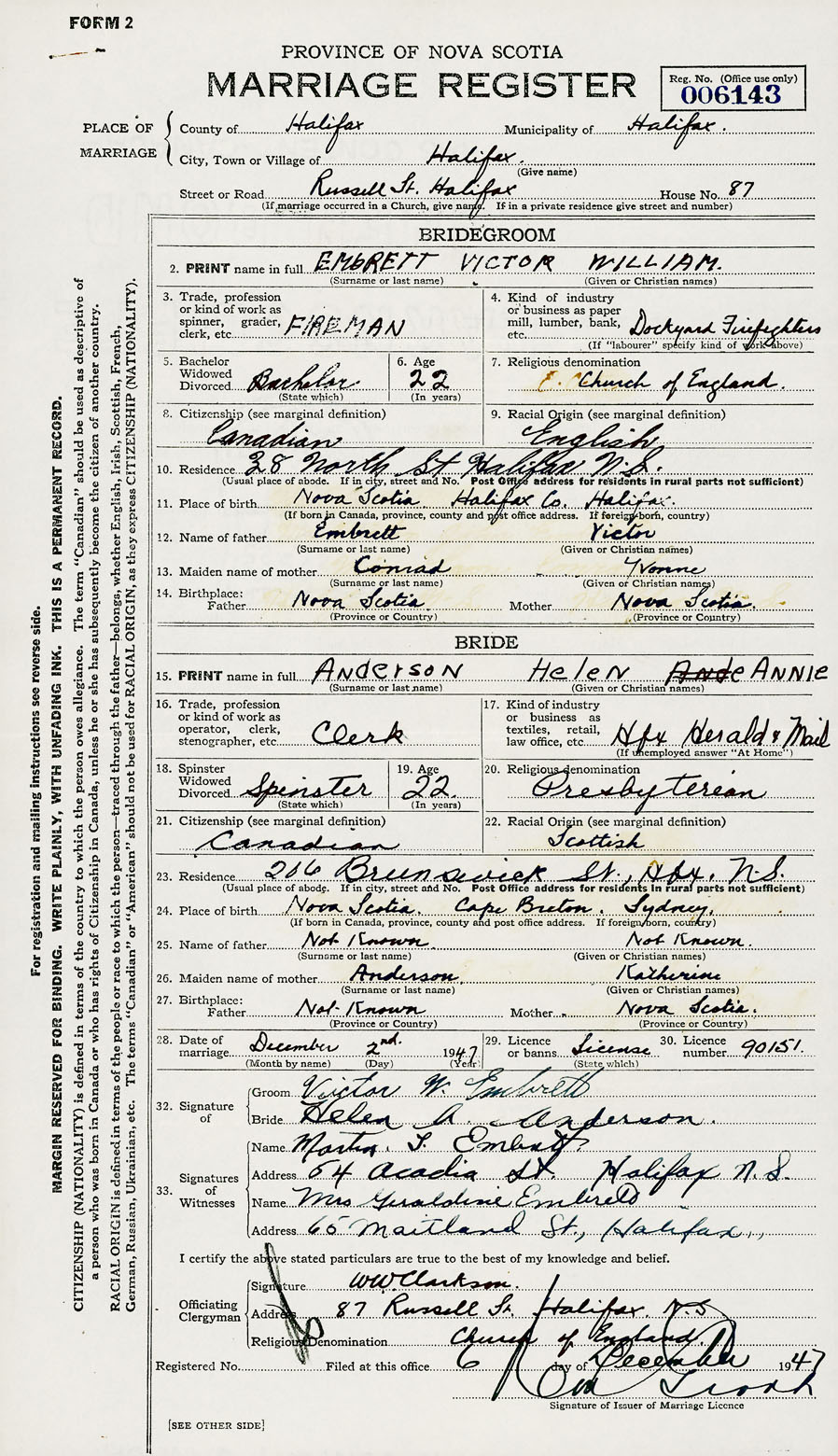 28. Date of marriage December 2 1947 29. By license or banns License 30. License number 90151