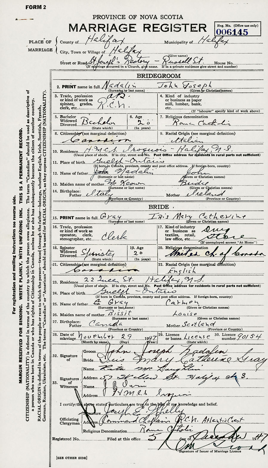28. Date of marriage November 29 1947 29. By license or banns License 30. License number 90154
