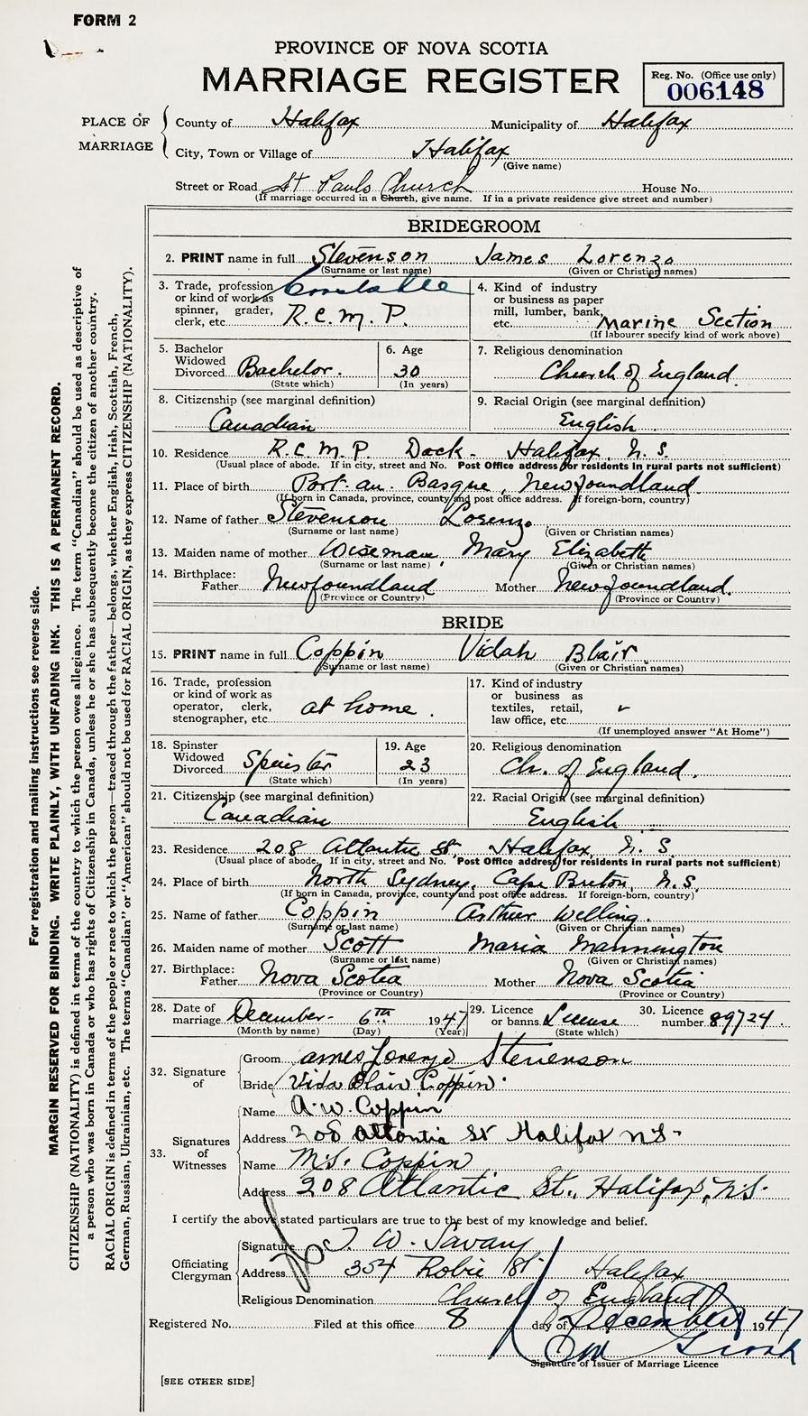 28. Date of marriage December 6 1947 29. By license or banns License 30. License number 89724