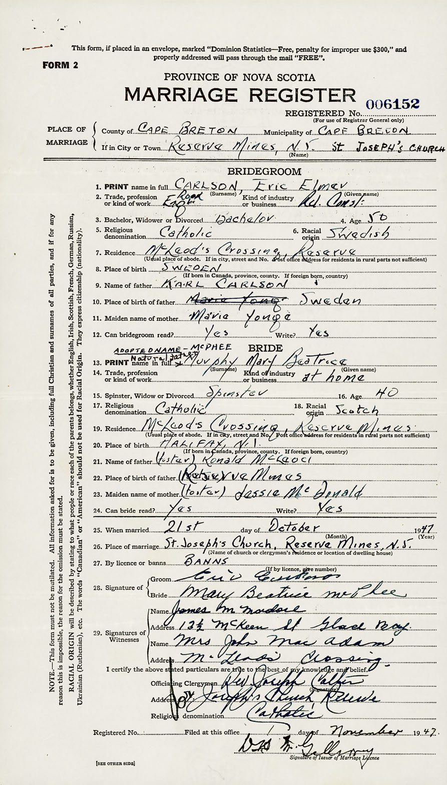 PLACE OF MARRIAGE County of Cape Breton in City or Town Reserve Mines