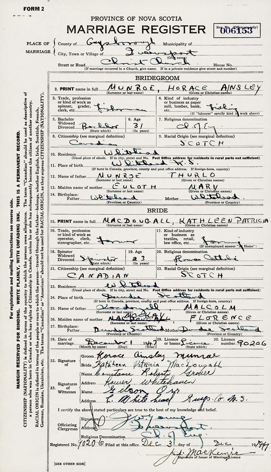 28. Date of marriage December 1 1947 29. By license or banns License 30. License number 90206