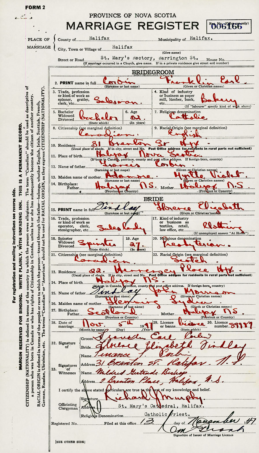 28. Date of marriage November 5 1947 29. By license or banns License 30. License number 89989