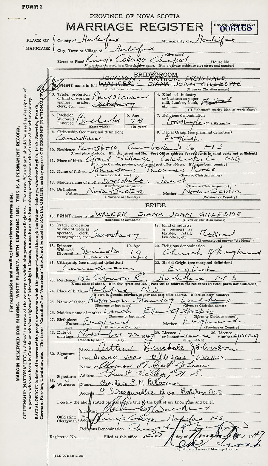 28. Date of marriage November 22 1947 29. By license or banns License 30. License number 90129