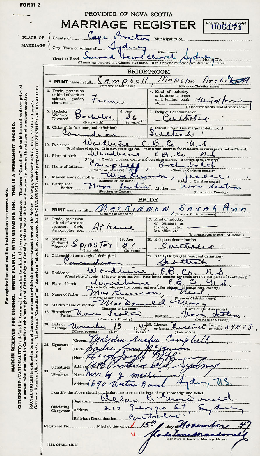 PLACE OF MARRIAGE County of Cape Breton