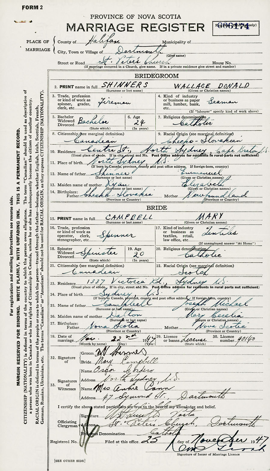 28. Date of marriage November 22 1947 29. By license or banns License 30. License number 90140