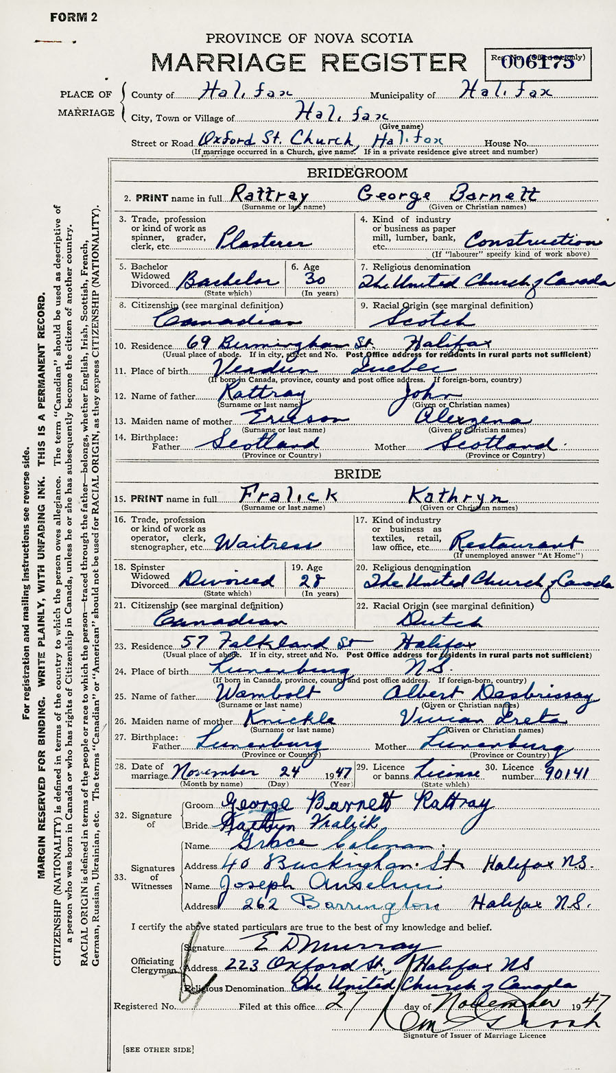 28. Date of marriage November 24 1947 29. By license or banns License 30. License number 90141