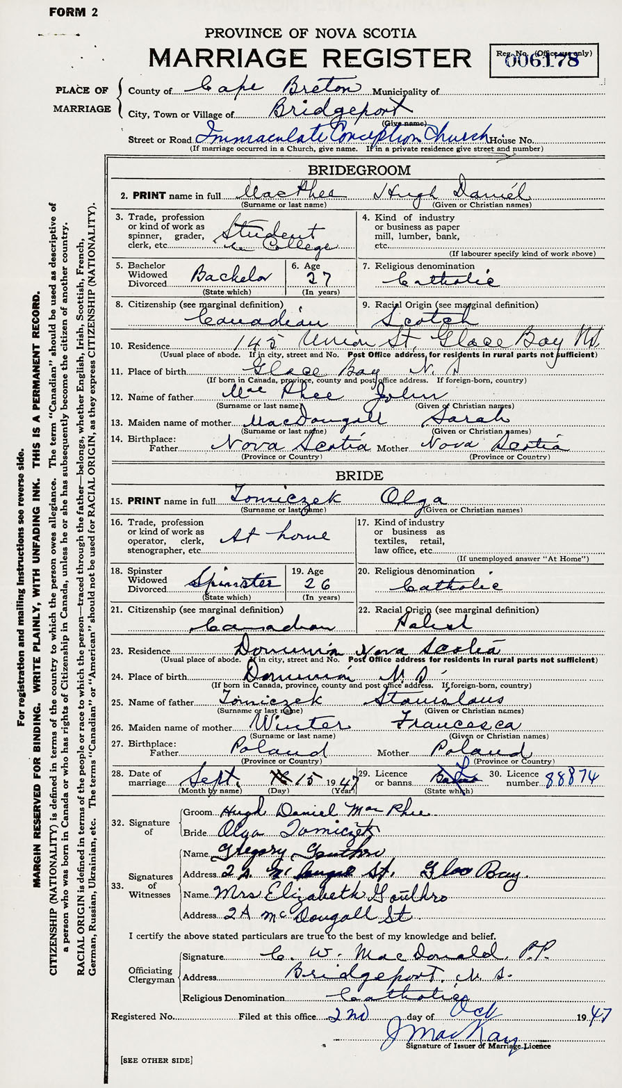 28. Date of marriage September 15 1947 29. By license or banns License 30. License number 88874