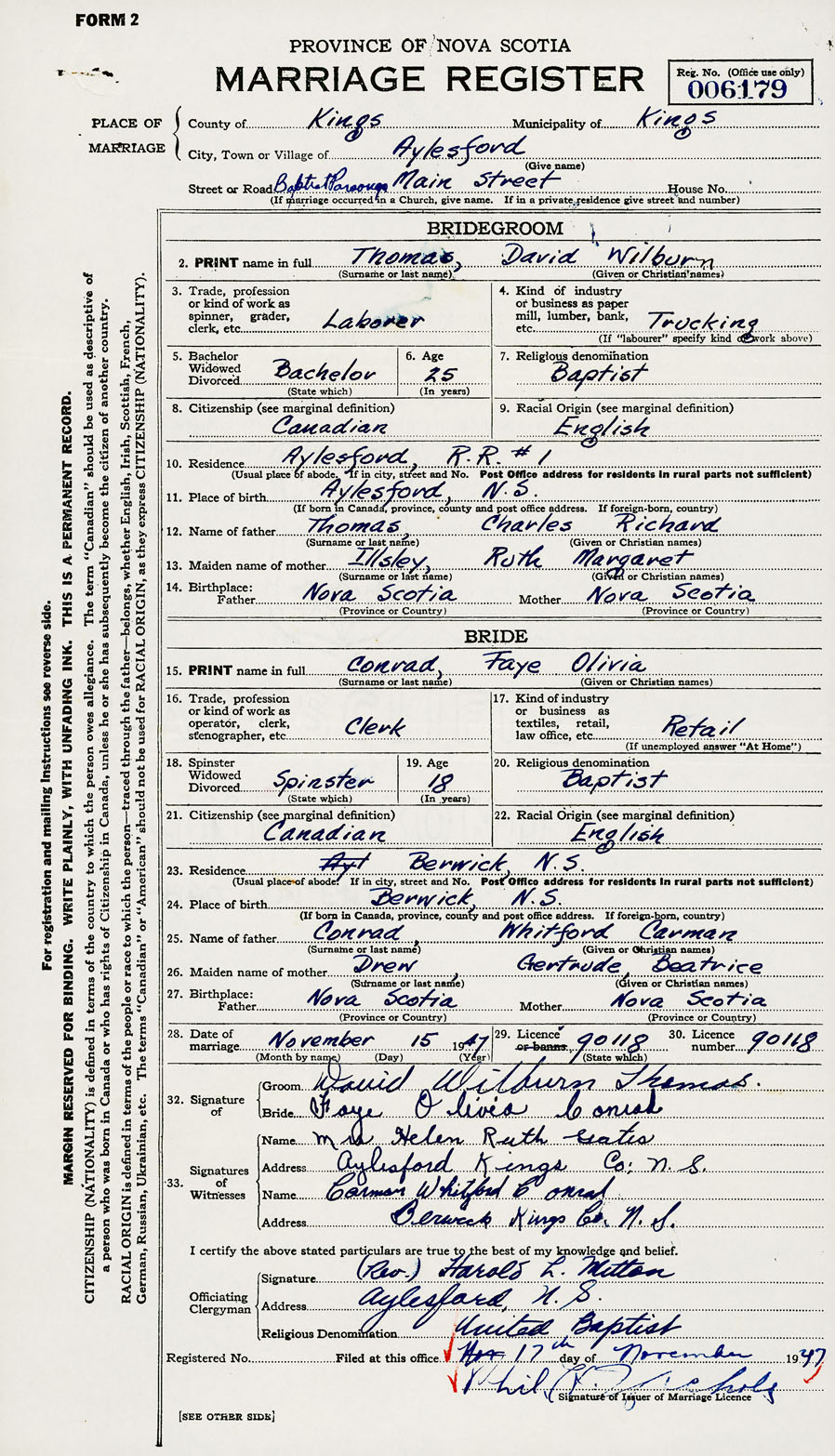 28. Date of marriage November 15 1947 29. By license or banns License 30. License number 90118