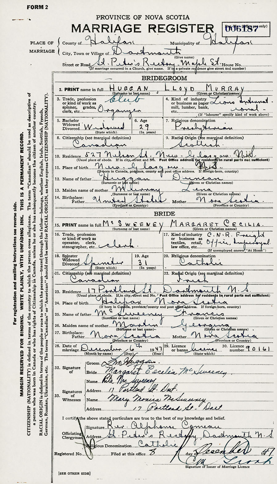 28. Date of marriage December 6 1947 29. By license or banns License 30. License number 90161