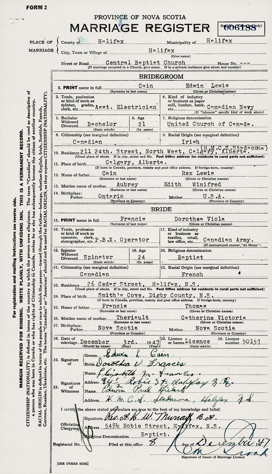 28. Date of marriage December 3 1947 29. By license or banns License 30. License number 90157