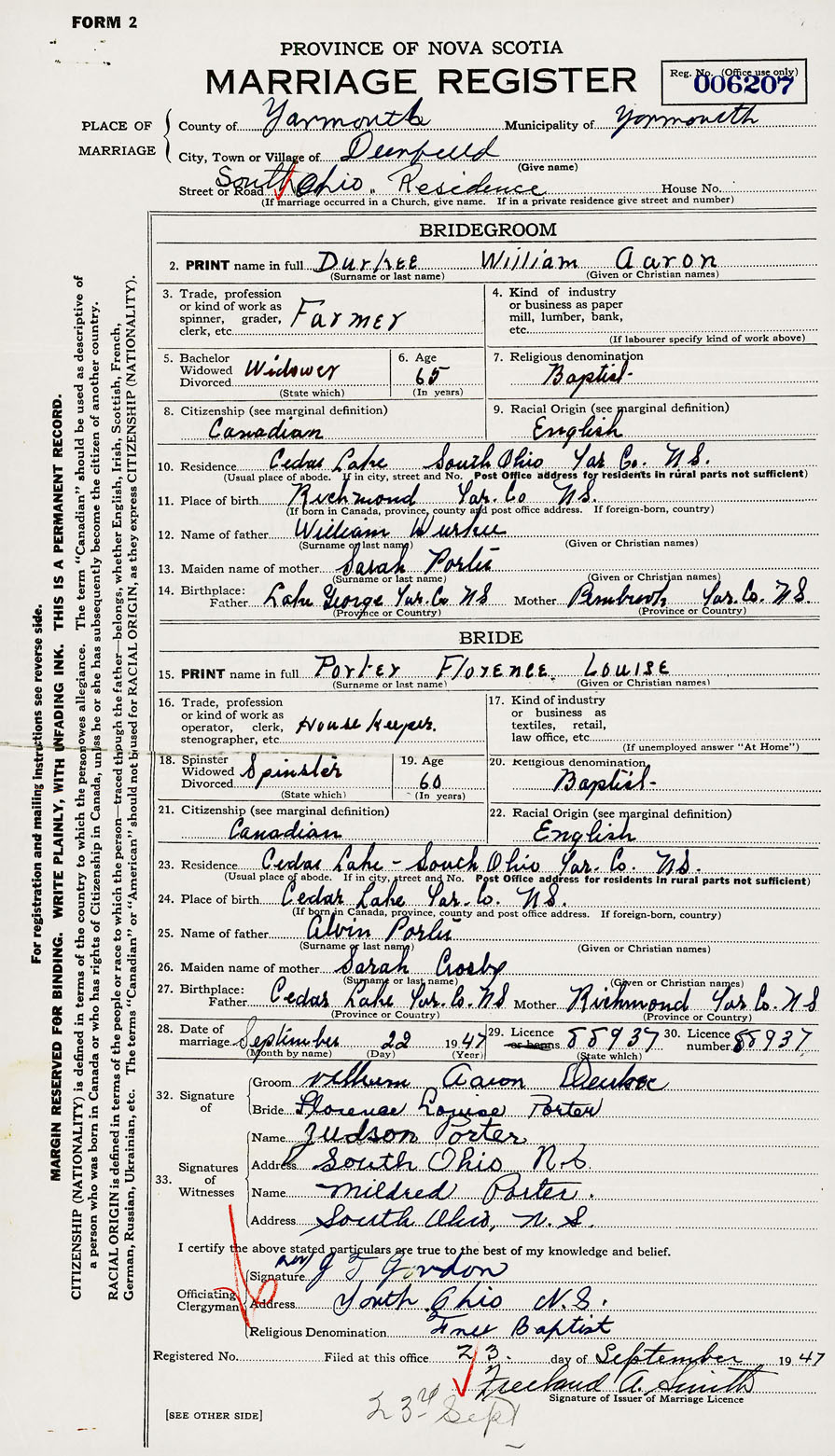 28. Date of marriage September 22 1947 29. By license or banns License 30. License number 88937