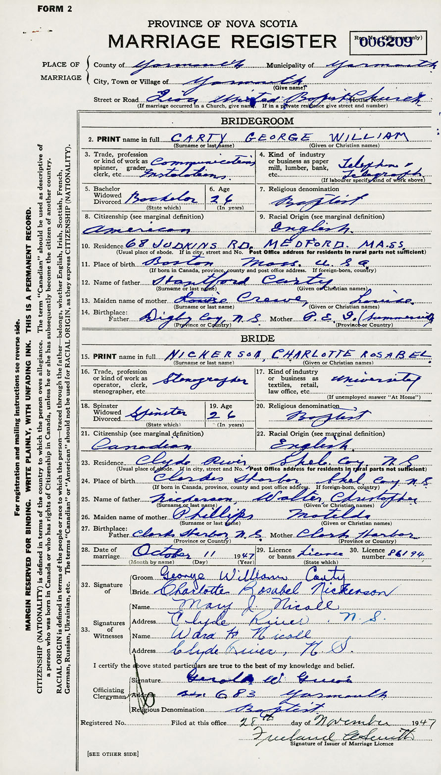 28. Date of marriage October 11 1947 29. By license or banns License 30. License number 86194