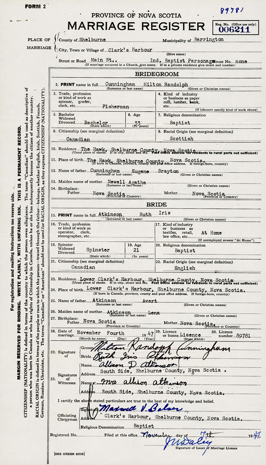 28. Date of marriage November 4 1947 29. By license or banns License 30. License number 89781
