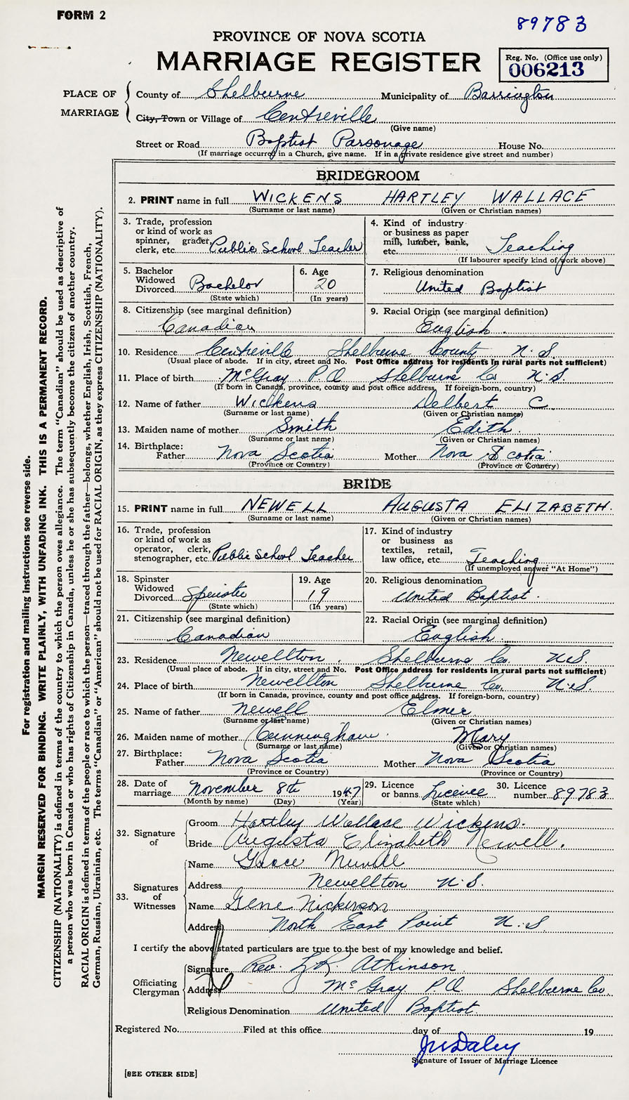 28. Date of marriage November 8 1947 29. By license or banns License 30. License number 89783