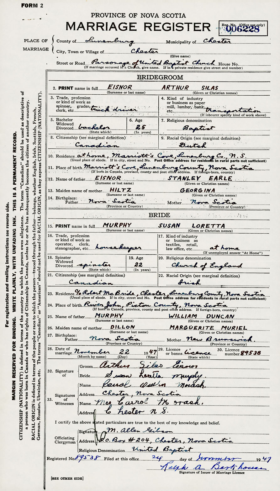 28. Date of marriage November 22 1947 29. By license or banns License 30. License number 89538
