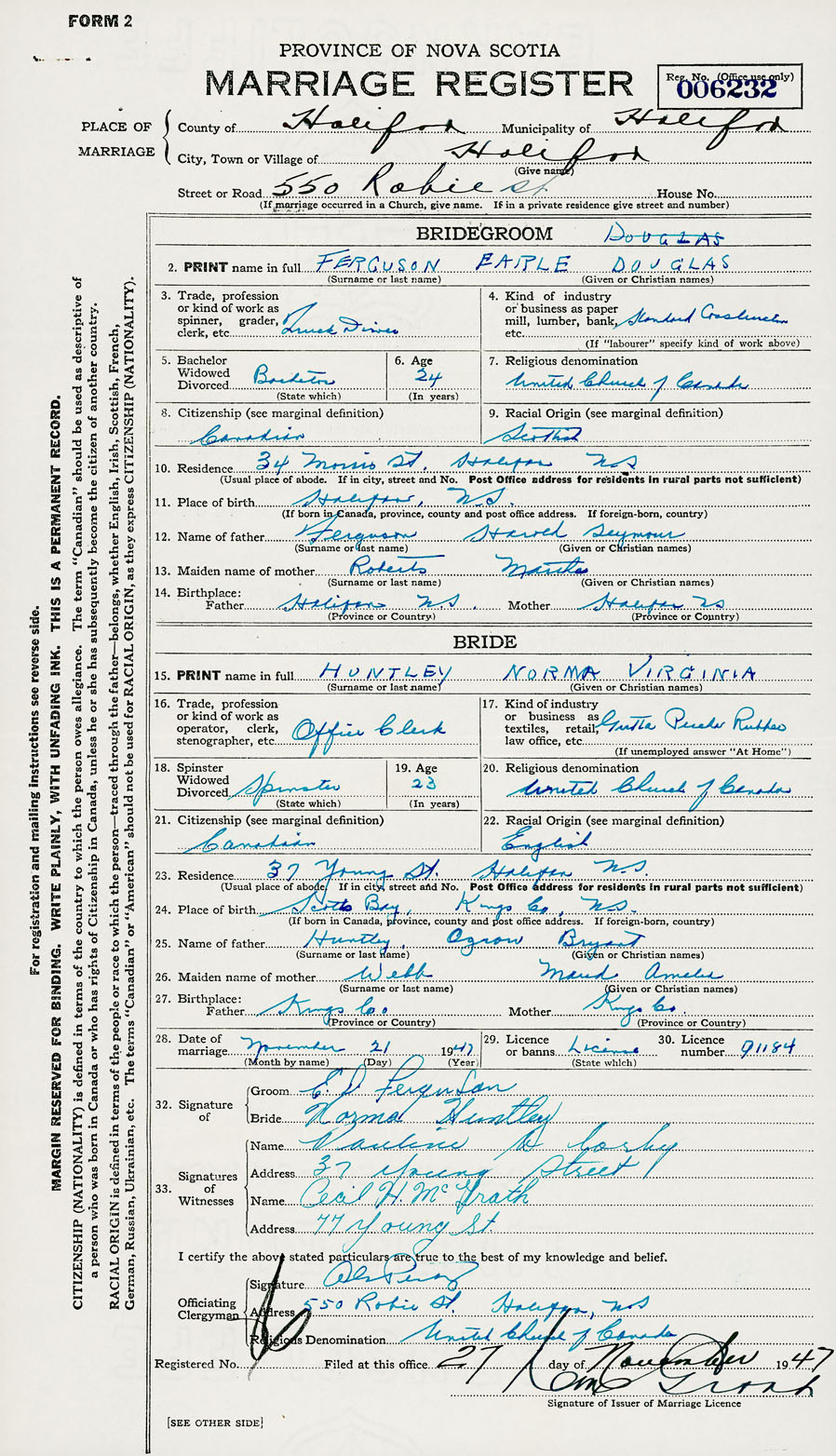 28. Date of marriage November 21 1947 29. By license or banns License 30. License number 91184