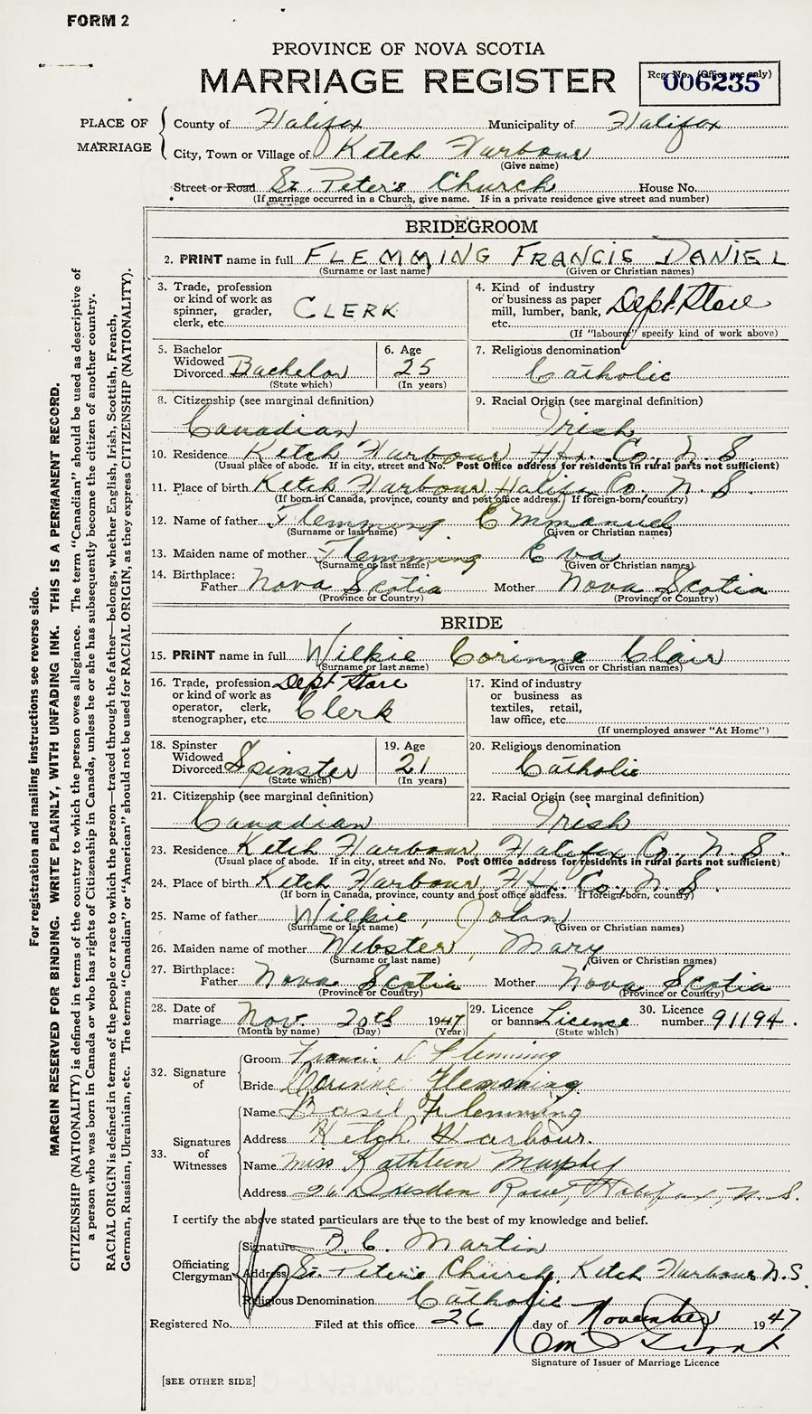 28. Date of marriage November 20 1947 29. By license or banns License 30. License number 91194