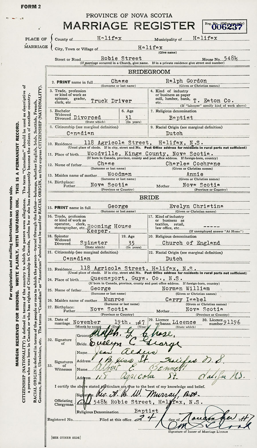 28. Date of marriage November 19 1947 29. By license or banns License 30. License number 91196