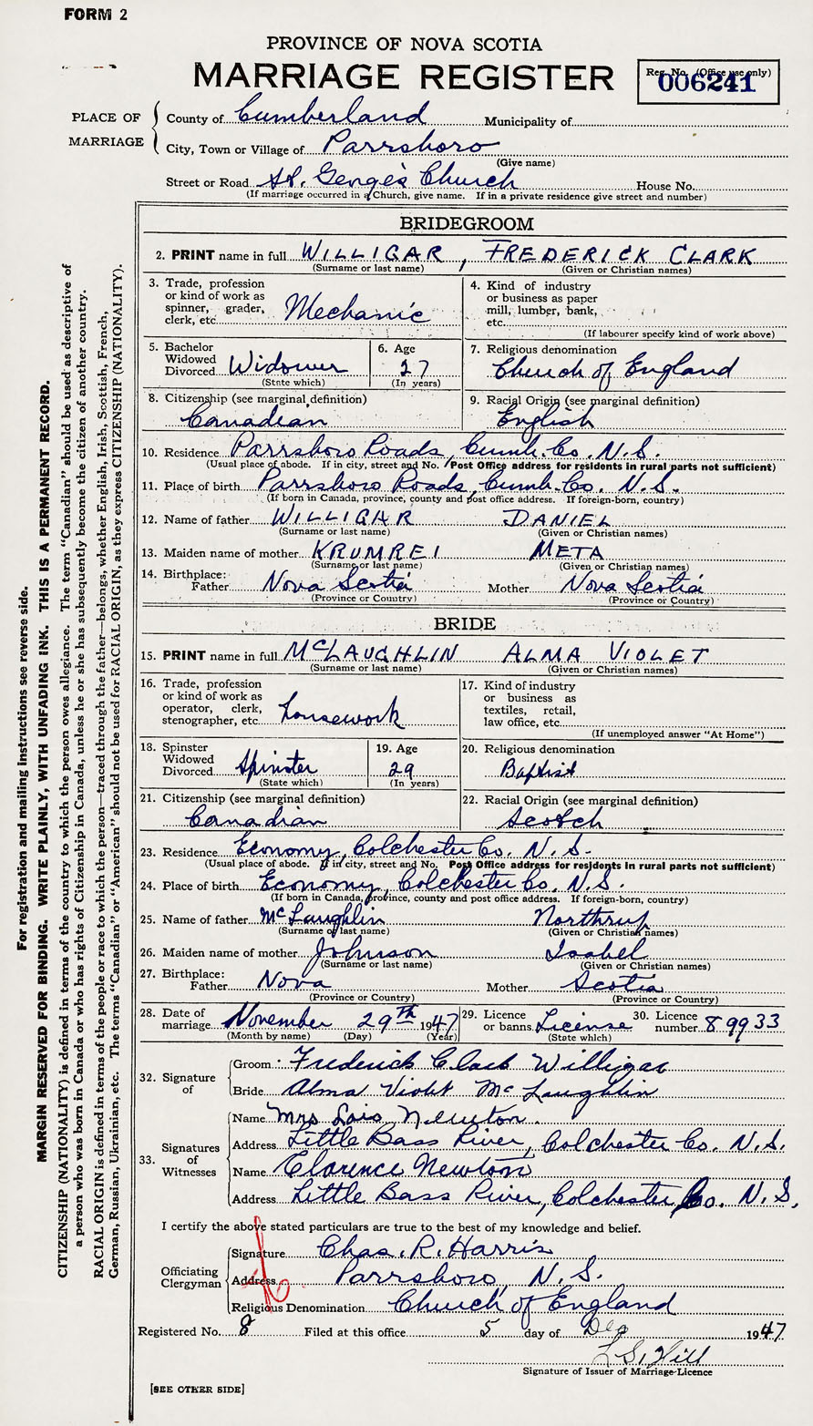 28. Date of marriage November 29 1947 29. By license or banns License 30. License number 89933