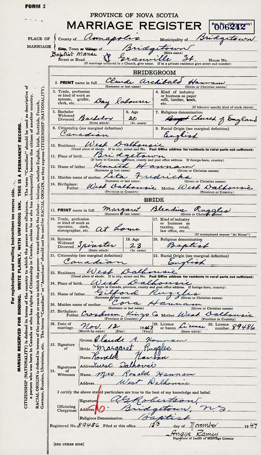 28. Date of marriage November 12 1947 29. By license or banns License 30. License number 89486