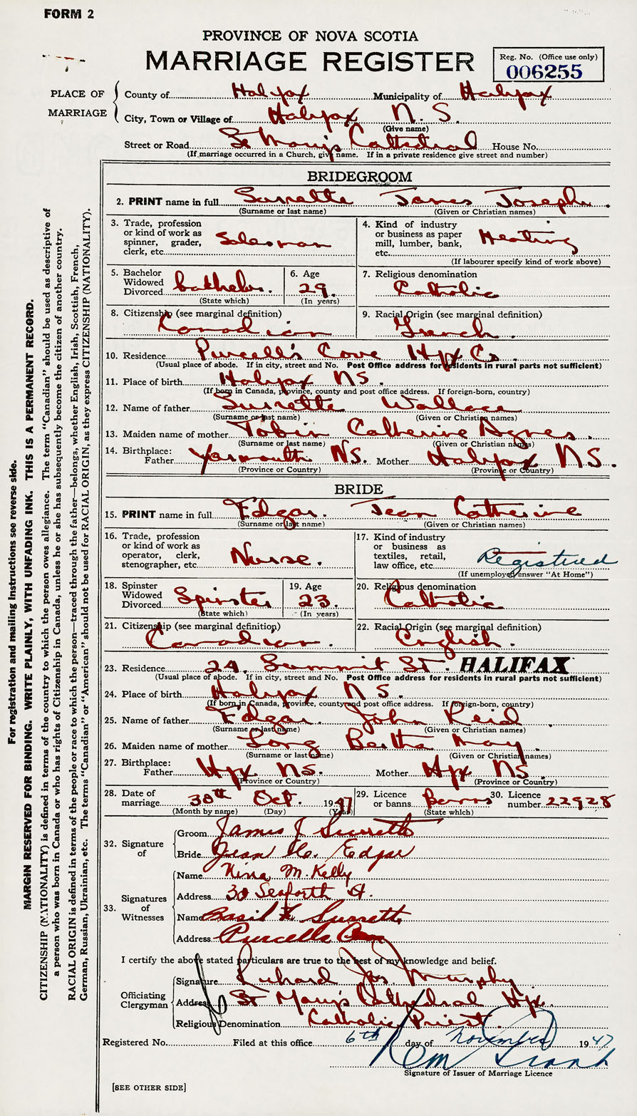 28. Date of marriage October 30 1947 29. By license or banns License 30. License number