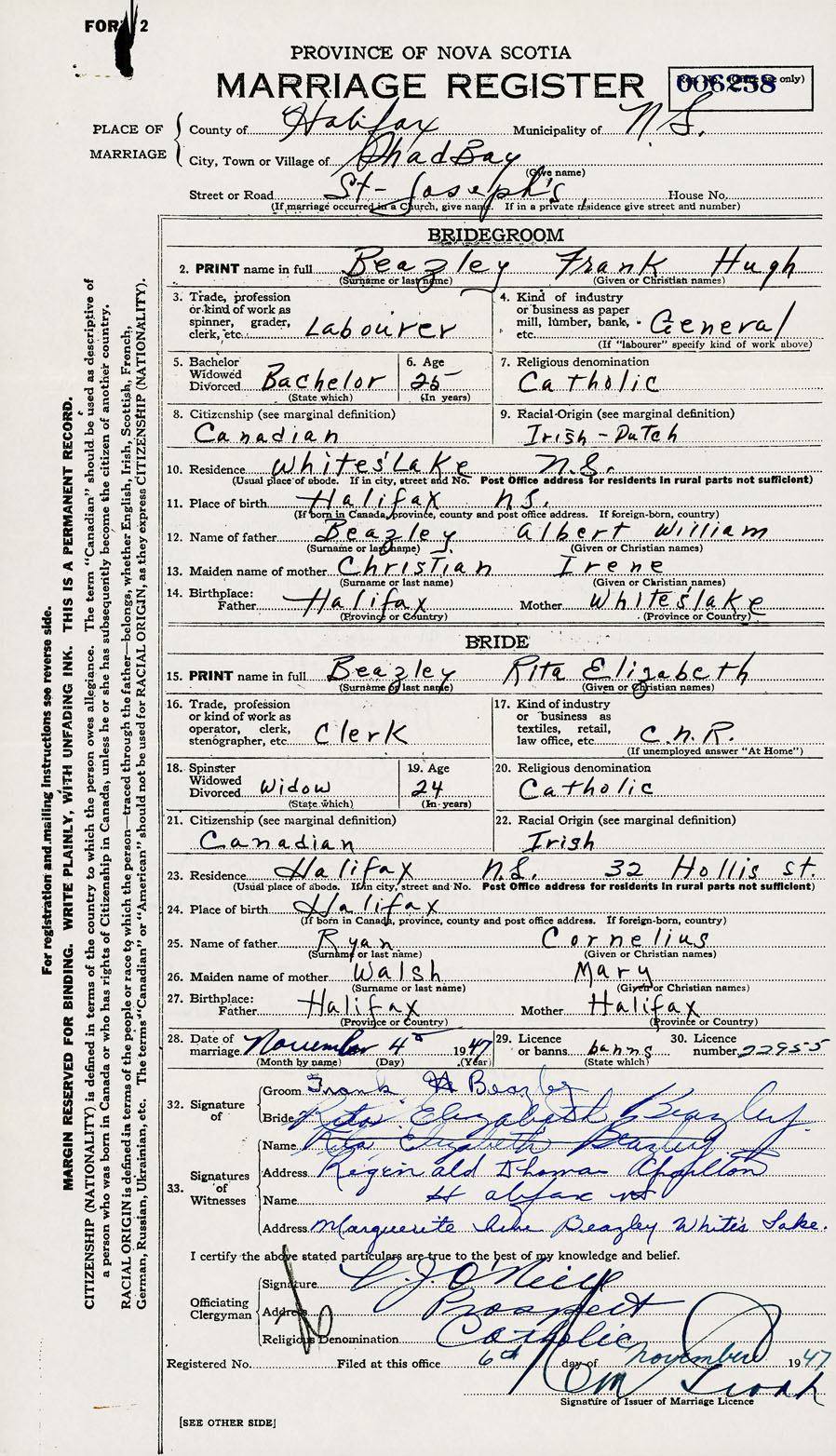 28. Date of marriage November 4 1947 29. By license or banns License 30. License number 22955