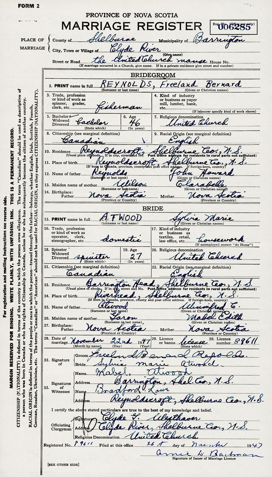 11. Place of birth Reynoldscroft, Shelburne, County, Nova Scotia