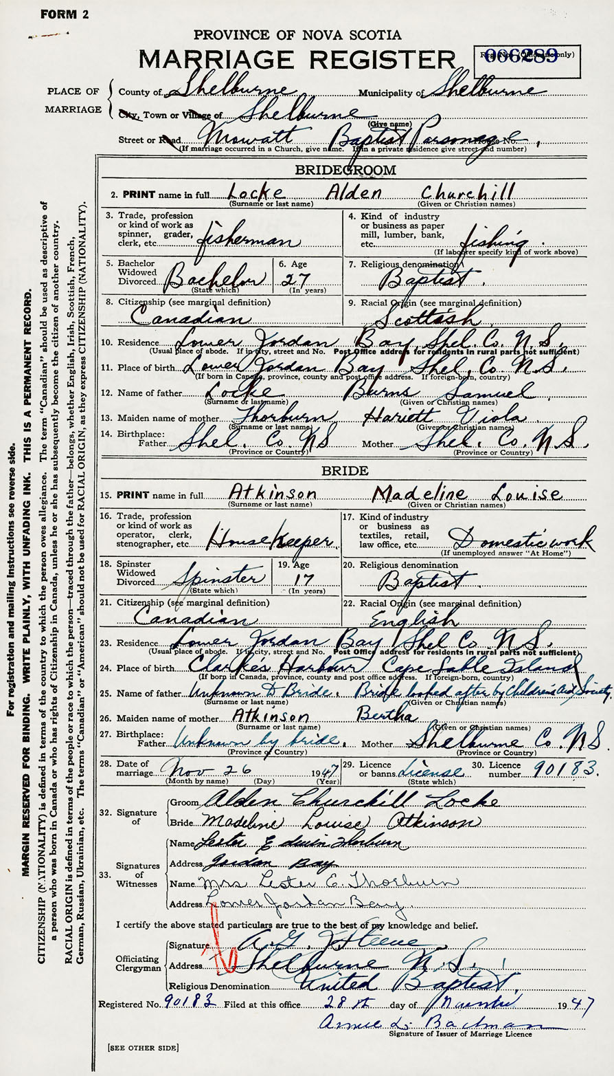 24. Place of birth Clarke's Harbour, Cape Sable Island, Shelb. County, N.S