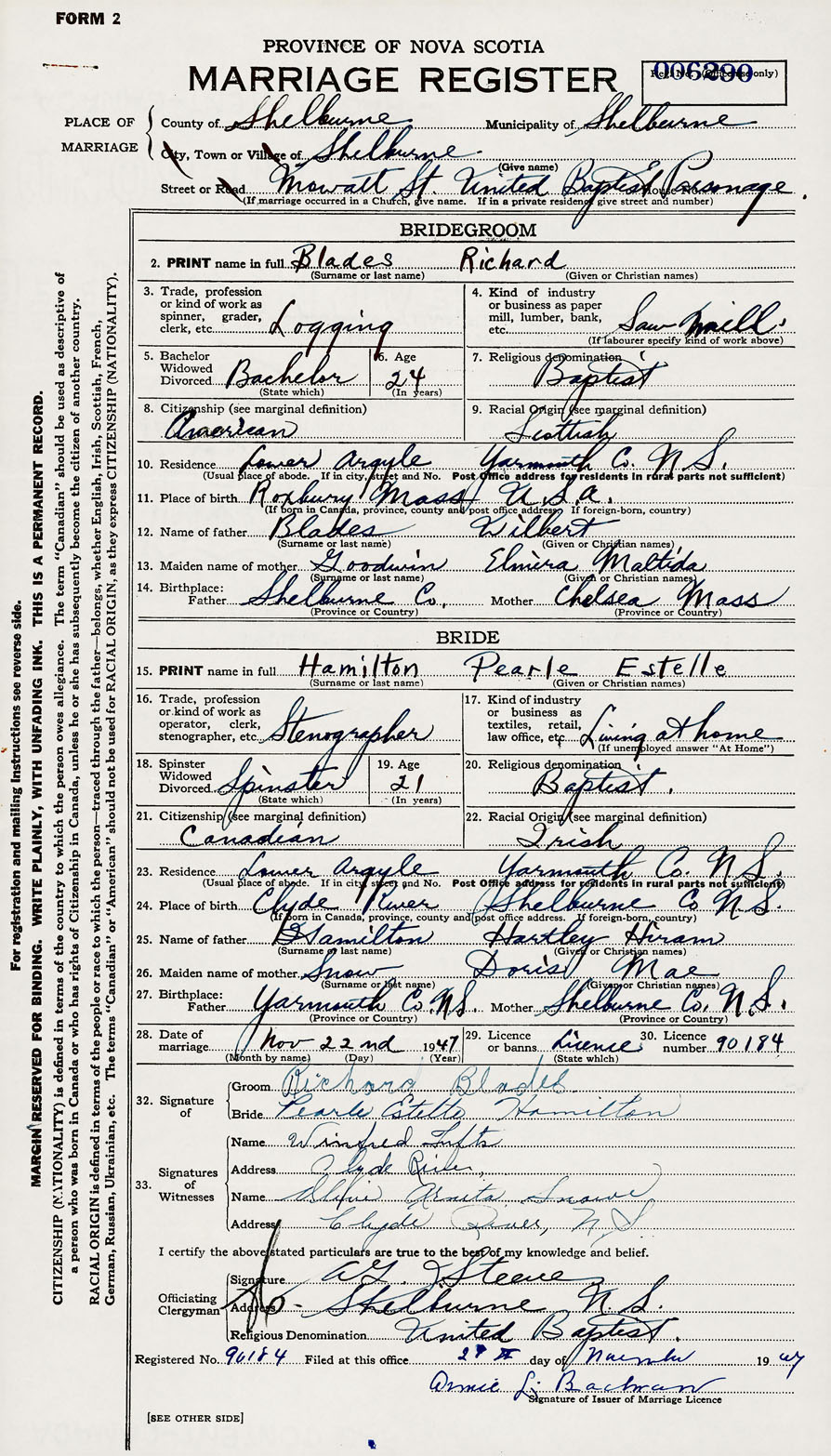 28. Date of marriage November 22 1947 29. By license or banns License 30. License number 90184