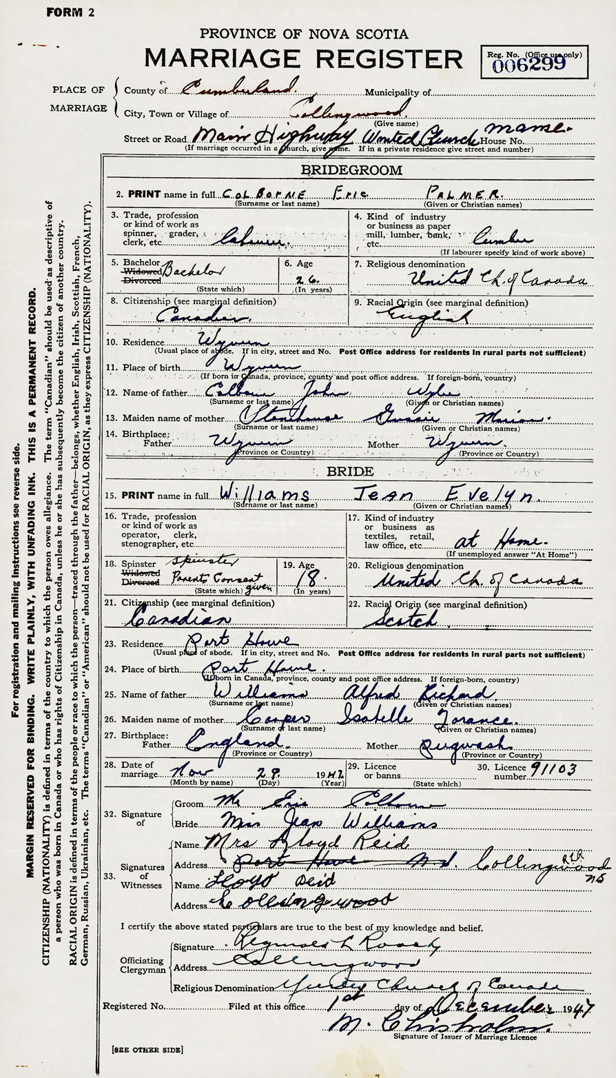 28. Date of marriage November 29 1947 29. By license or banns License 30. License number 91103