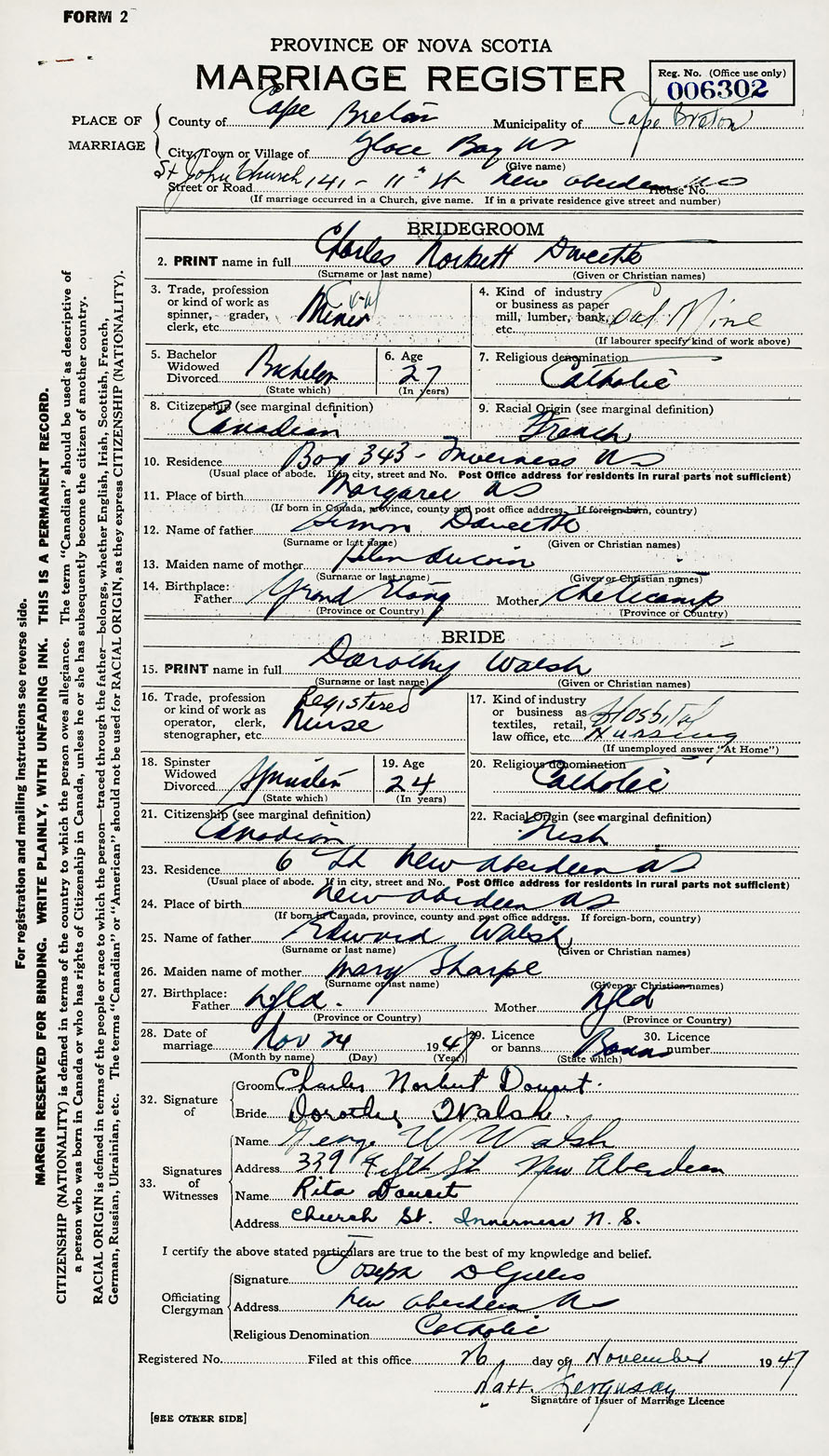 28. Date of marriage November 24 1947 29. By license or banns Banns 30. License number Banns