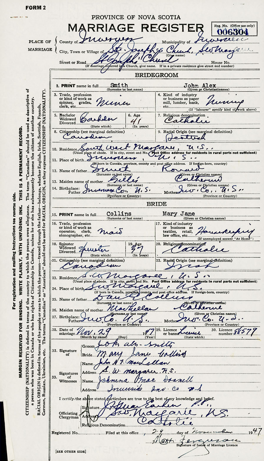 28. Date of marriage November 29 1947 29. By license or banns License 30. License number 88579