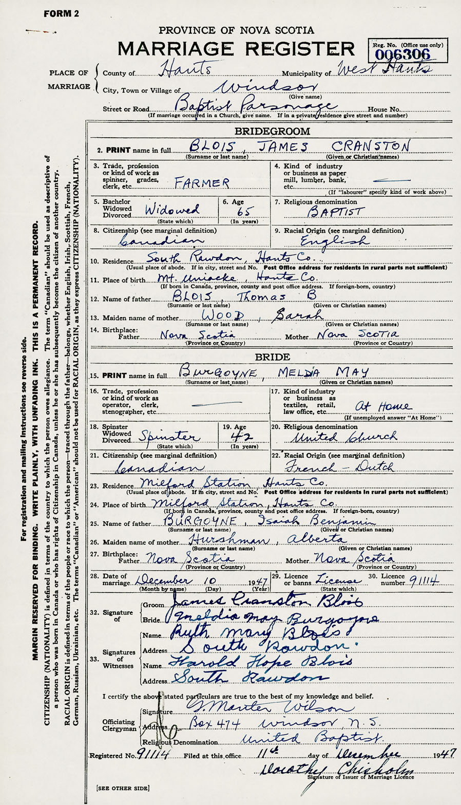 28. Date of marriage December 10 1947 29. By license or banns License 30. License number 91114
