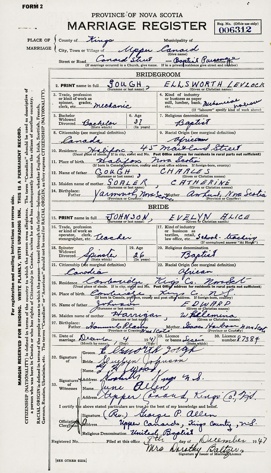 28. Date of marriage December 4 1947 29. By license or banns License 30. License number 87384
