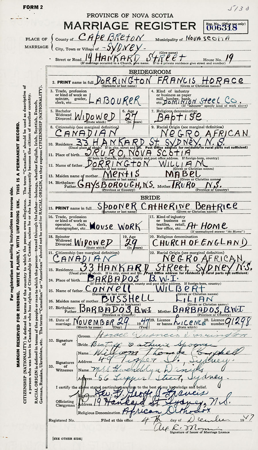 28. Date of marriage November 29 1947 29. By license or banns License 30. License number 91298