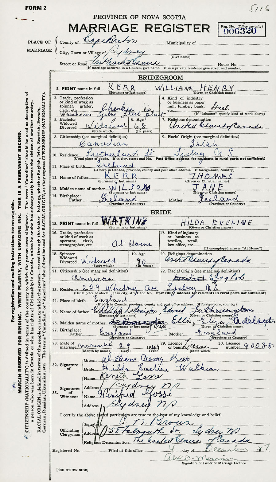 28. Date of marriage November 29 1947 29. By license or banns License 30. License number 90088