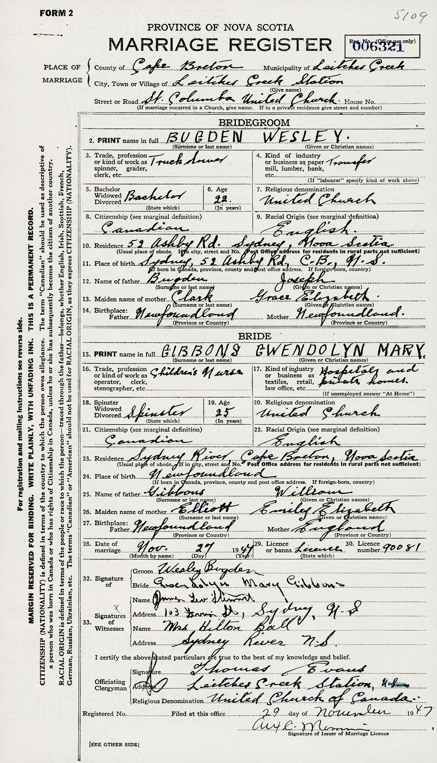 28. Date of marriage November 27 1947 29. By license or banns License 30. License number 90081