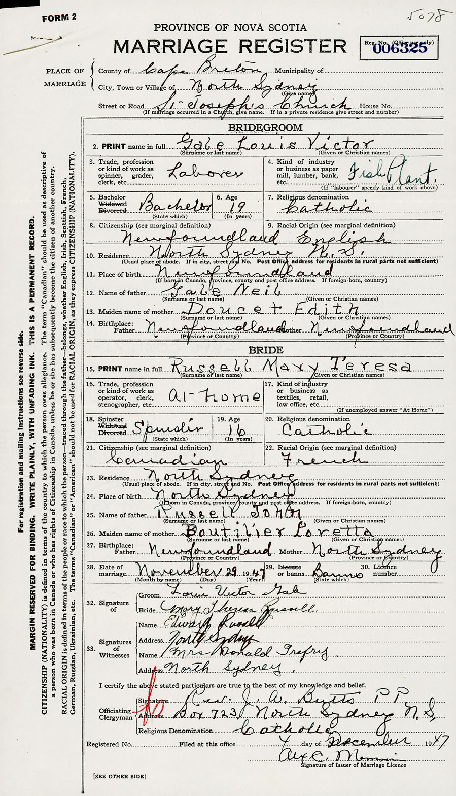 28. Date of marriage November 29 1947 29. By license or banns License 30. License number