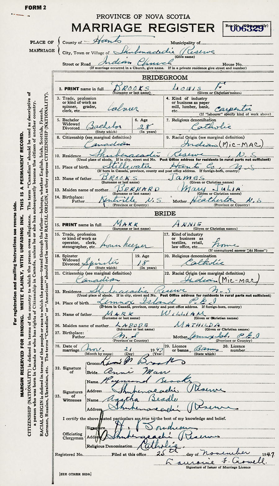 8. Citizenship Canadian 9. Racial origin Indian (Mic-Mac)