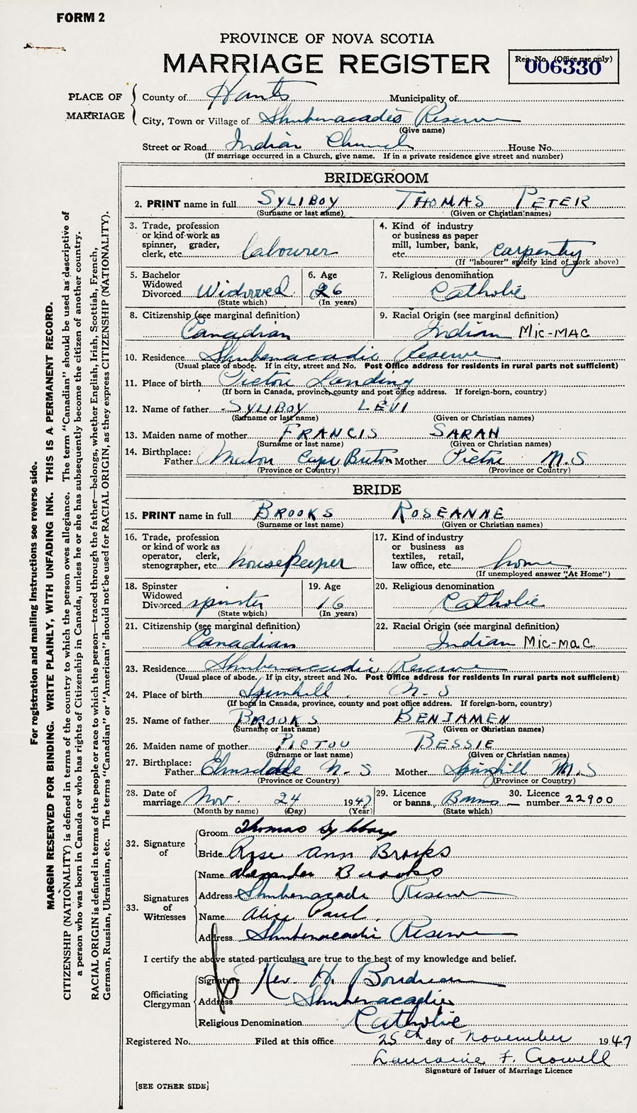 28. Date of marriage November 24 1947 29. By license or banns License 30. License number 22900