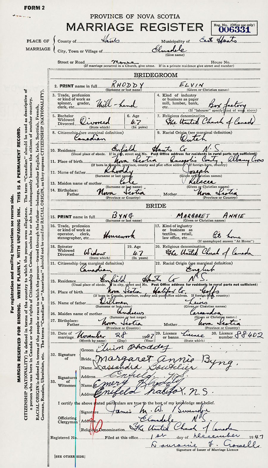 28. Date of marriage November 28 1947 29. By license or banns License 30. License number 88402