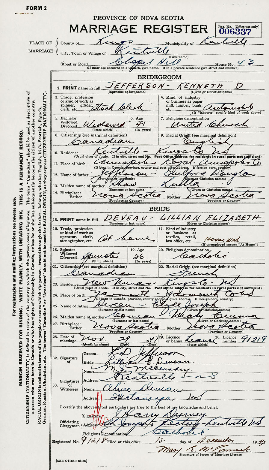 28. Date of marriage November 29 1947 29. By license or banns License 30. License number 91219