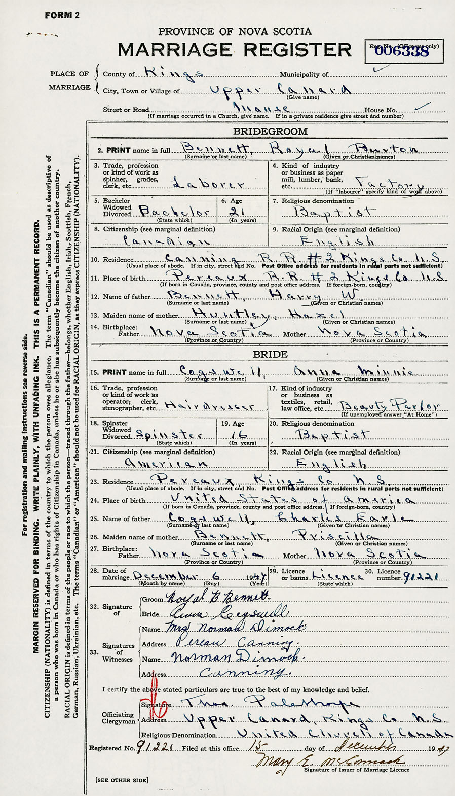 28. Date of marriage December 6 1947 29. By license or banns License 30. License number 91221